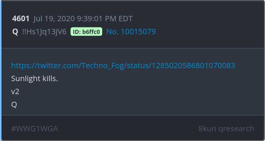 Sunlight kills. v2 https://twitter.com/Techno_Fog/status/1285020586801070083 Posted 07/18/2025 09:03 PM Categories Clips, Q