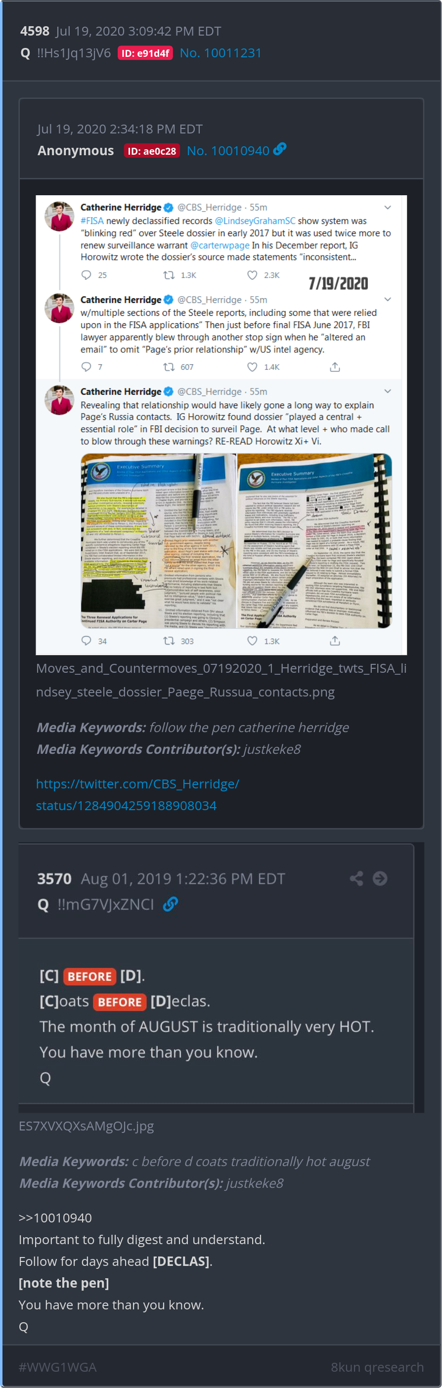 Important to fully digest and understand. Follow for days ahead [DECLAS]. [note the pen] You have more than you know. https://twitter.com/CBS_Herridge/status/1284904259188908034 Posted 07/18/2025 09:08 PM Categories Clips, Q