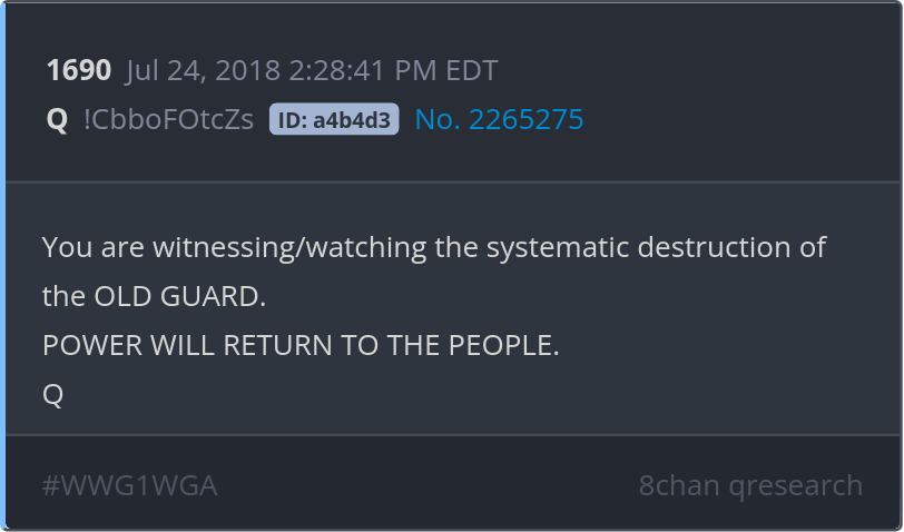 You are witnessing/watching the systematic destruction of the OLD GUARD. POWER WILL RETURN TO THE PEOPLE. Posted 07/24/2025 08:10 AM Categories Clips, Q