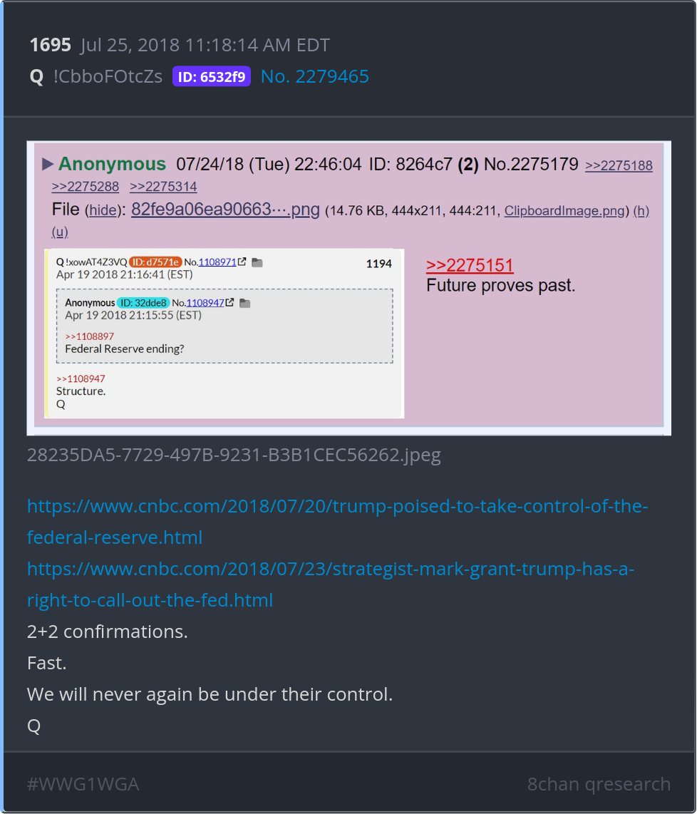 2+2 confirmations. Fast. We will never again be under their control. https://www.cnbc.com/2018/07/20/trump-poised-to-take-control-of-the-federal-reserve.html https://www.cnbc.com/2018/07/23/strategist-mark-grant-trump-has-a-right-to-call-out-the-fed.html Posted 07/24/2025 08:53 PM Categories Clips, Q