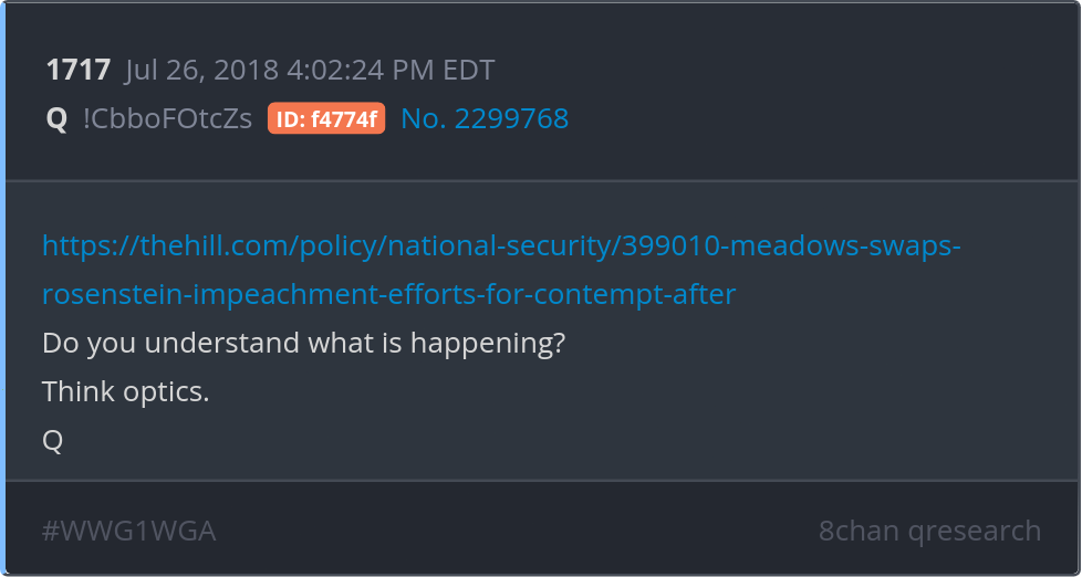 Do you understand what is happening? Think optics. https://thehill.com/policy/national-security/399010-meadows-swaps-rosenstein-impeachment-efforts-for-contempt-after Posted 07/25/2025 08:32 PM Categories Clips, Q