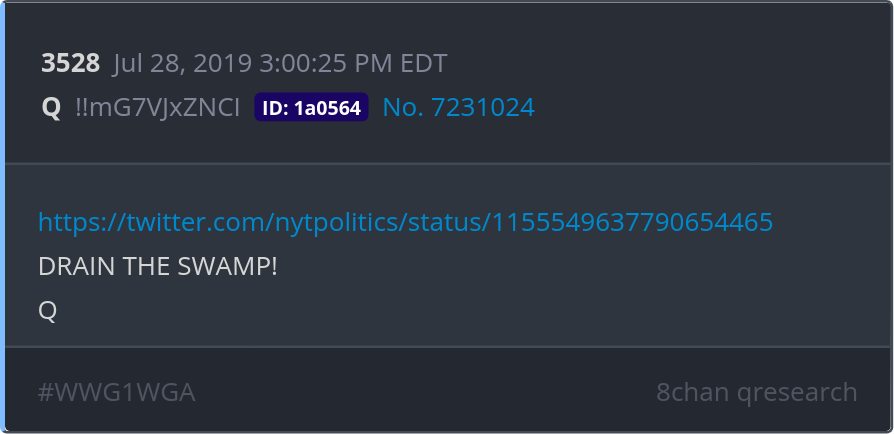 DRAIN THE SWAMP! https://twitter.com/nytpolitics/status/1155549637790654465 Posted 07/27/2025 08:31 PM Categories Clips, Q