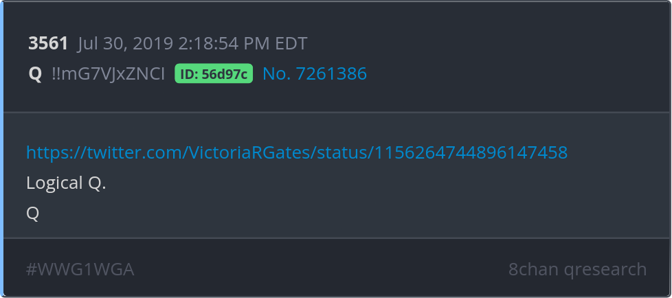 Logical Q. https://twitter.com/VictoriaRGates/status/1156264744896147458 Posted 07/29/2025 08:55 PM Categories Clips, Q