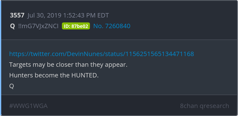 Targets may be closer than they appear. Hunters become the HUNTED. https://twitter.com/DevinNunes/status/1156251565134471168 Posted 07/29/2025 08:59 PM Categories Clips, Q