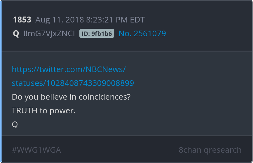 Do you believe in coincidences? TRUTH to power. https://twitter.com/NBCNews/statuses/1028408743309008899 Posted 08/10/2025 08:56 PM Categories Clips, Q