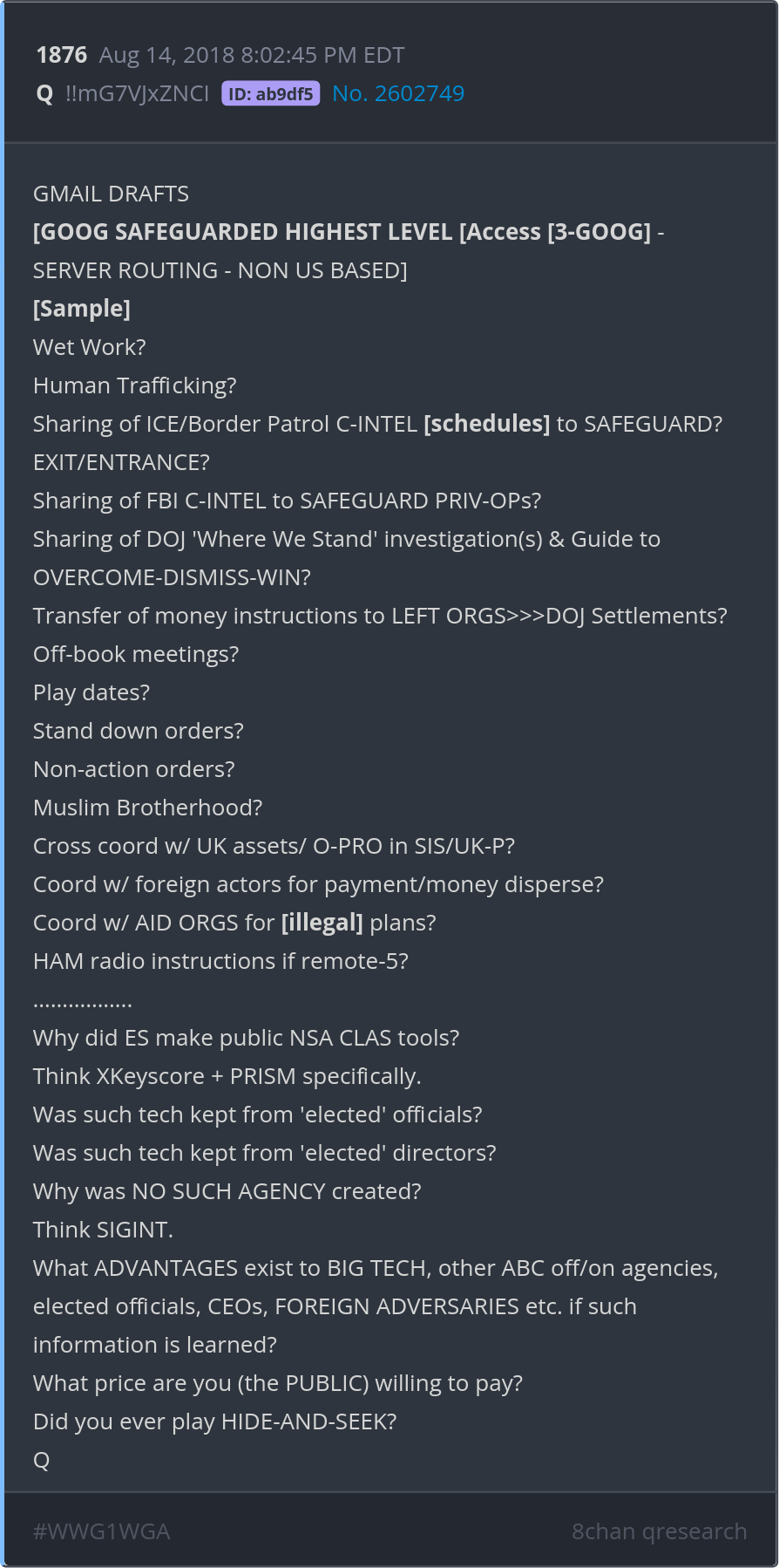 Wet Work? Human Trafficking? Sharing of ICE/Border Patrol C-INTEL [schedules] to SAFEGUARD? EXIT/ENTRANCE? Sharing of FBI C-INTEL to SAFEGUARD PRIV-OPs? Posted 08/13/2025 08:42 PM Categories Clips, Q