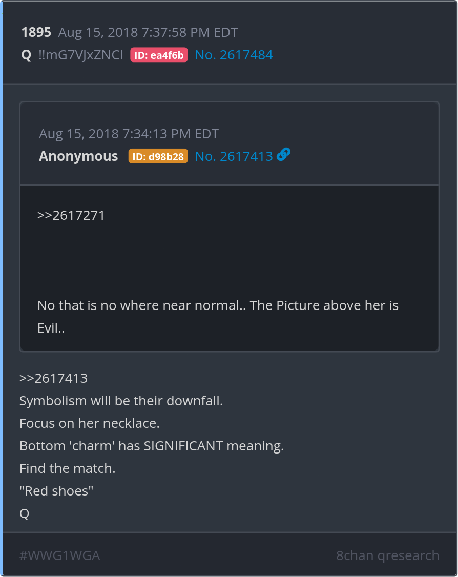 Symbolism will be their downfall. Focus on her necklace. Bottom 'charm' has SIGNIFICANT meaning. Find the match. "Red shoes" Posted 08/14/2025 08:44 PM Categories Clips, Q