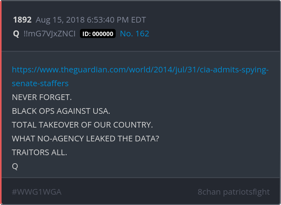 NEVER FORGET. BLACK OPS AGAINST USA. TOTAL TAKEOVER OF OUR COUNTRY. WHAT NO-AGENCY LEAKED THE DATA? TRAITORS ALL. https://www.theguardian.com/world/2014/jul/31/cia-admits-spying-senate-staffers Posted 08/14/2025 08:48 PM Categories Clips, Q