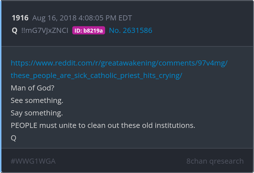 See something. Say something. PEOPLE must unite to clean out these old institutions. https://www.reddit.com/r/greatawakening/comments/97v4mg/these_people_are_sick_catholic_priest_hits_crying/ Posted 08/15/2025 08:39 PM Categories Clips, Q