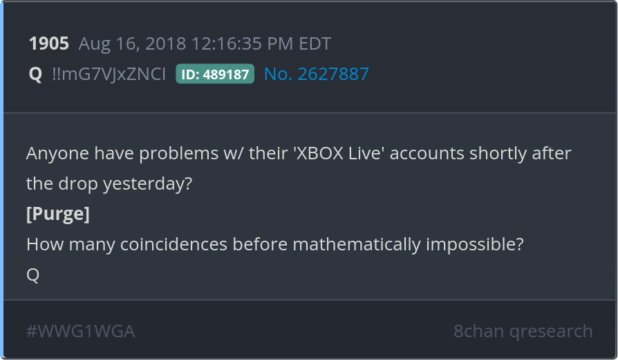 Anyone have problems w/ their 'XBOX Live' accounts shortly after the drop yesterday? [Purge] How many coincidences before mathematically impossible? Posted 08/15/2025 08:44 PM Categories Clips, Q
