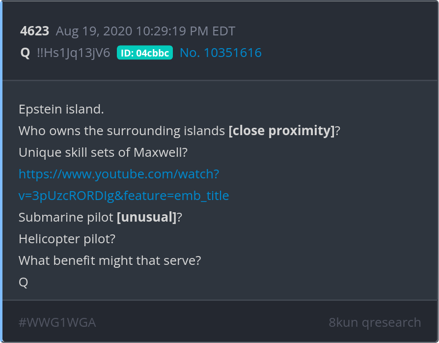 Epstein island. Who owns the surrounding islands [close proximity]? Unique skill sets of Maxwell? Submarine pilot [unusual]? Helicopter pilot? What benefit might that serve? https://www.youtube.com/watch?v=3pUzcRORDIg&feature=emb_title Posted 08/18/2025 09:01 PM Categories Clips, Q