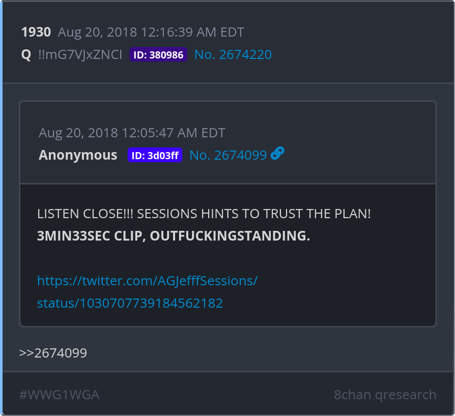 LISTEN CLOSE!!! https://twitter.com/AGJefffSessions/status/1030707739184562182 Posted 08/19/2025 08:46 PM Categories Clips, Q