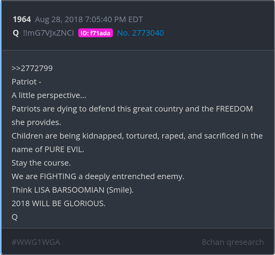 A little perspective… Patriots are dying to defend this great country and the FREEDOM she provides. Children are being kidnapped, tortured, raped, and sacrificed in the name of PURE EVIL. Stay the course. Posted 08/27/2025 08:02 PM Categories Clips, Q