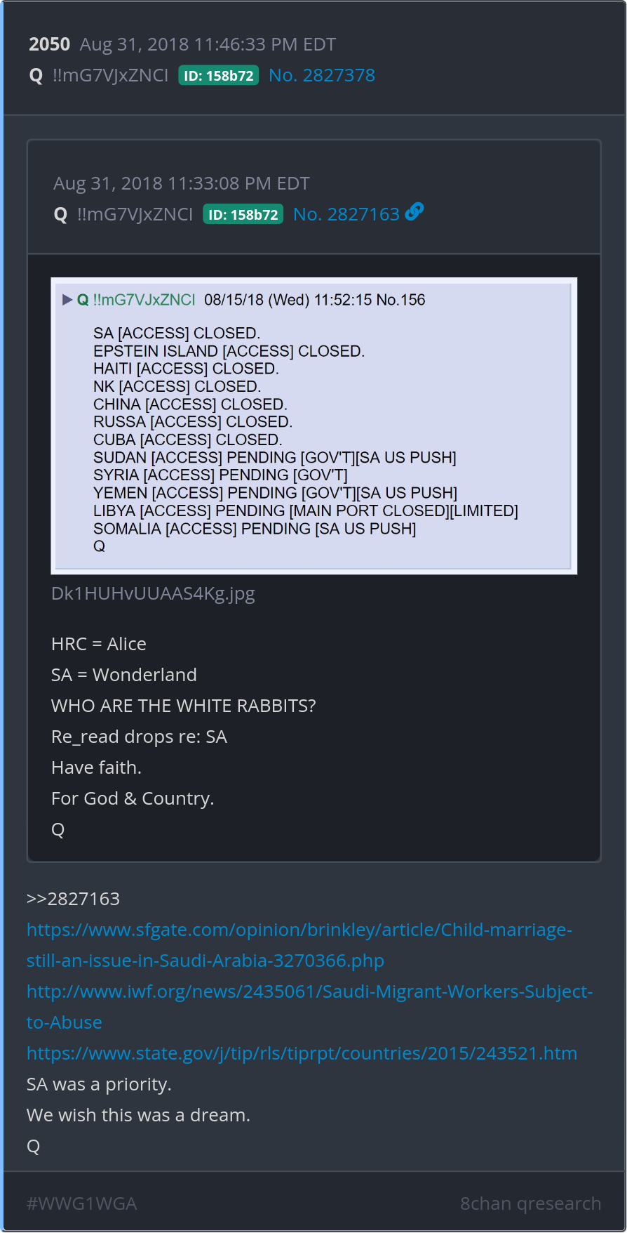 HRC = Alice SA = Wonderland WHO ARE THE WHITE RABBITS? Re_read drops re: SA Have faith. For God & Country. https://www.sfgate.com/opinion/brinkley/article/Child-marriage-still-an-issue-in-Saudi-Arabia-3270366.php http://www.iwf.org/news/2435061/Saudi-Migrant-Workers-Subject-to-Abuse https://www.state.gov/j/tip/rls/tiprpt/countries/2015/243521.htm Posted 08/30/2025 08:27 PM Categories Clips, Q