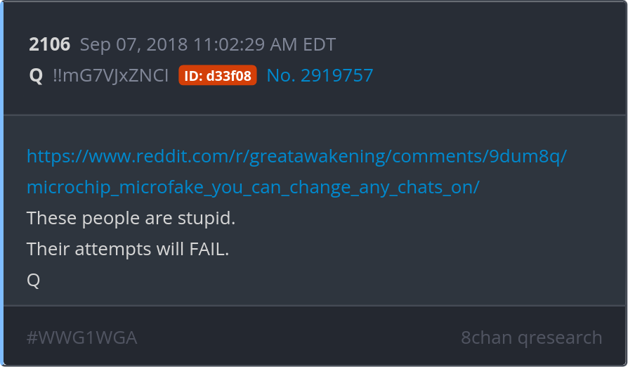 These people are stupid. Their attempts will FAIL. https://www.reddit.com/r/greatawakening/comments/9dum8q/microchip_microfake_you_can_change_any_chats_on/ Posted 09/06/2025 09:12 PM Categories Clips, Q
