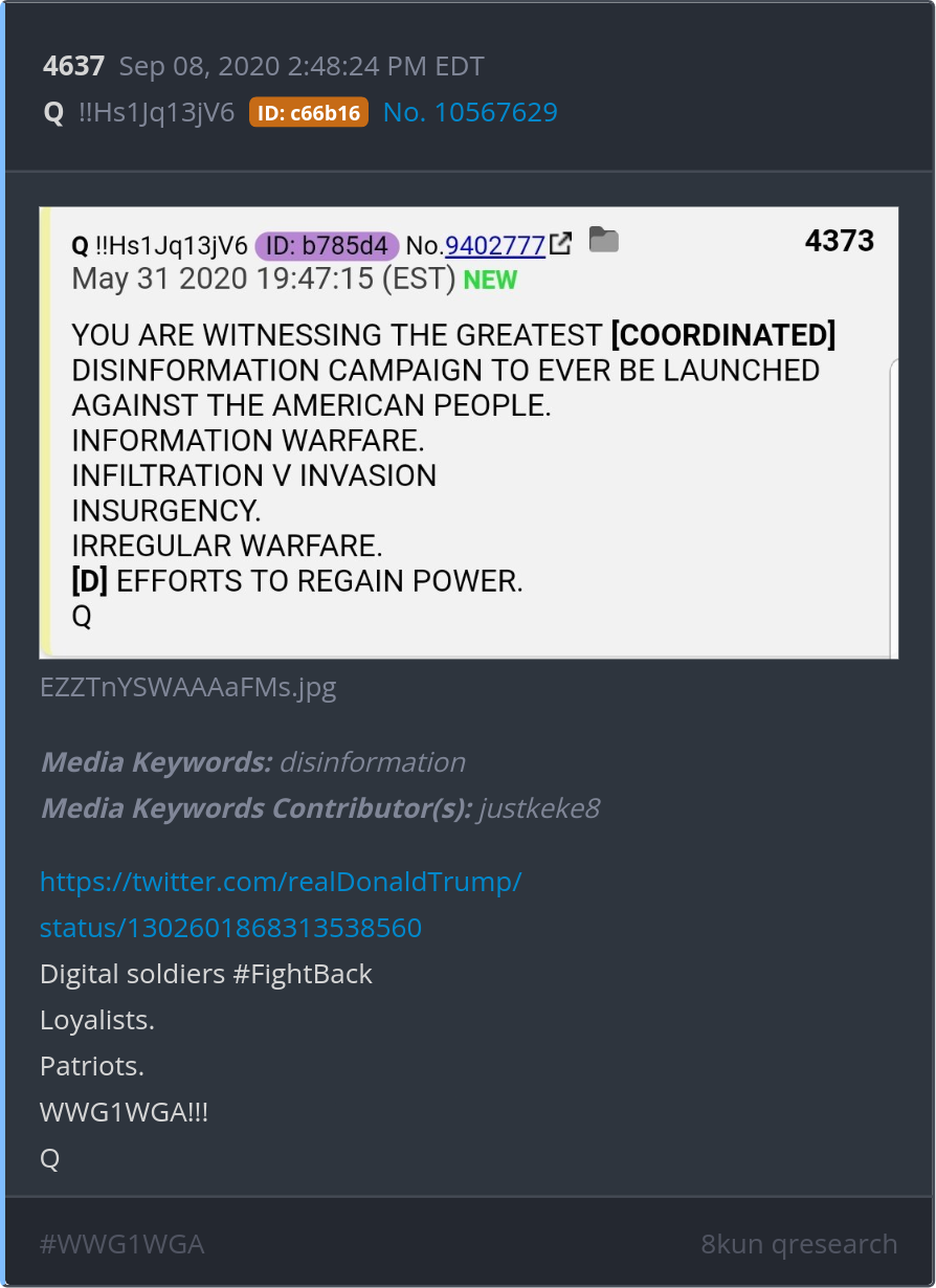 Digital soldiers #FightBack Loyalists. Patriots. WWG1WGA!!! https://twitter.com/realDonaldTrump/status/1302601868313538560 Posted 09/07/2025 09:13 PM Categories Clips, Q