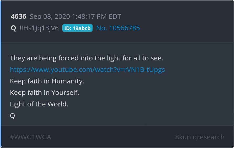 They are being forced into the light for all to see. Keep faith in Humanity. Keep faith in Yourself. Light of the World. https://www.youtube.com/watch?v=rVN1B-tUpgs Posted 09/07/2025 09:15 PM Categories Clips, Q