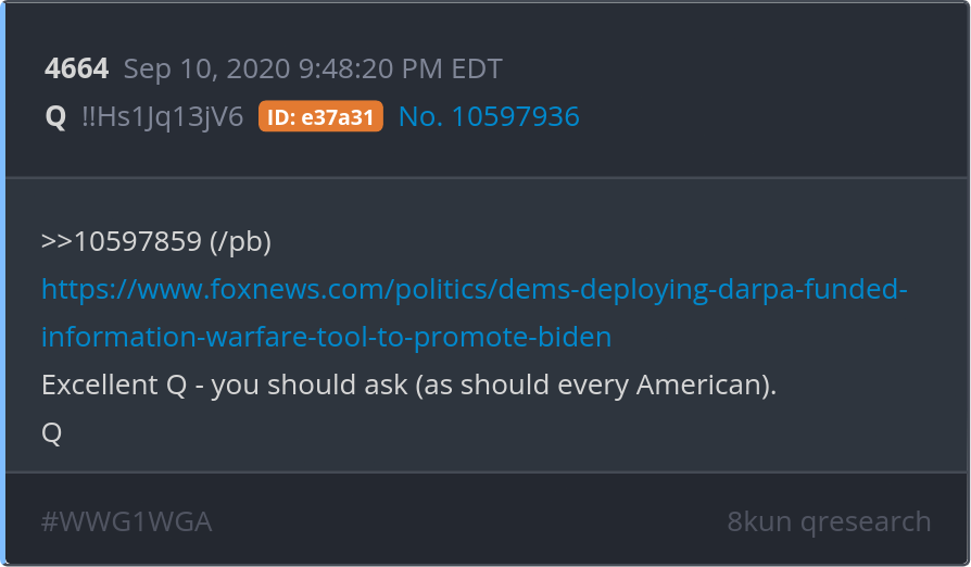 Excellent Q - you should ask (as should every American). https://www.foxnews.com/politics/dems-deploying-darpa-funded-information-warfare-tool-to-promote-biden Posted 09/09/2025 09:00 PM Categories Clips, Q