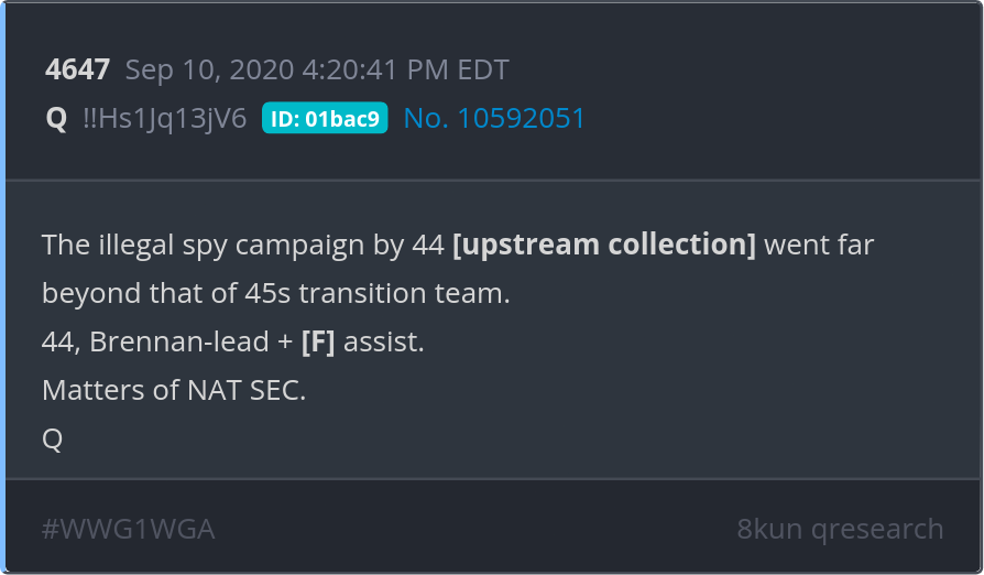 The illegal spy campaign by 44 [upstream collection] went far beyond that of 45s transition team. 44, Brennan-lead + [F] assist. Matters of NAT SEC. Posted 09/09/2025 09:14 PM Categories Clips, Q