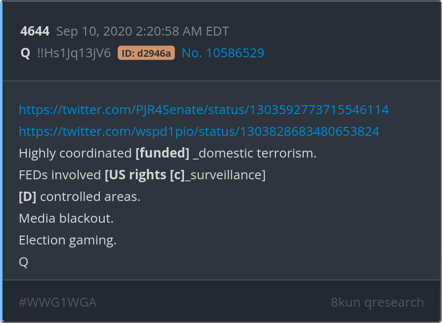 Highly coordinated [funded] _domestic terrorism. FEDs involved [US rights [c]_surveillance] [D] controlled areas. Media blackout. Election gaming. https://twitter.com/PJR4Senate/status/1303592773715546114 https://twitter.com/wspd1pio/status/1303828683480653824 Posted 09/09/2025 09:27 PM Categories Clips, Q
