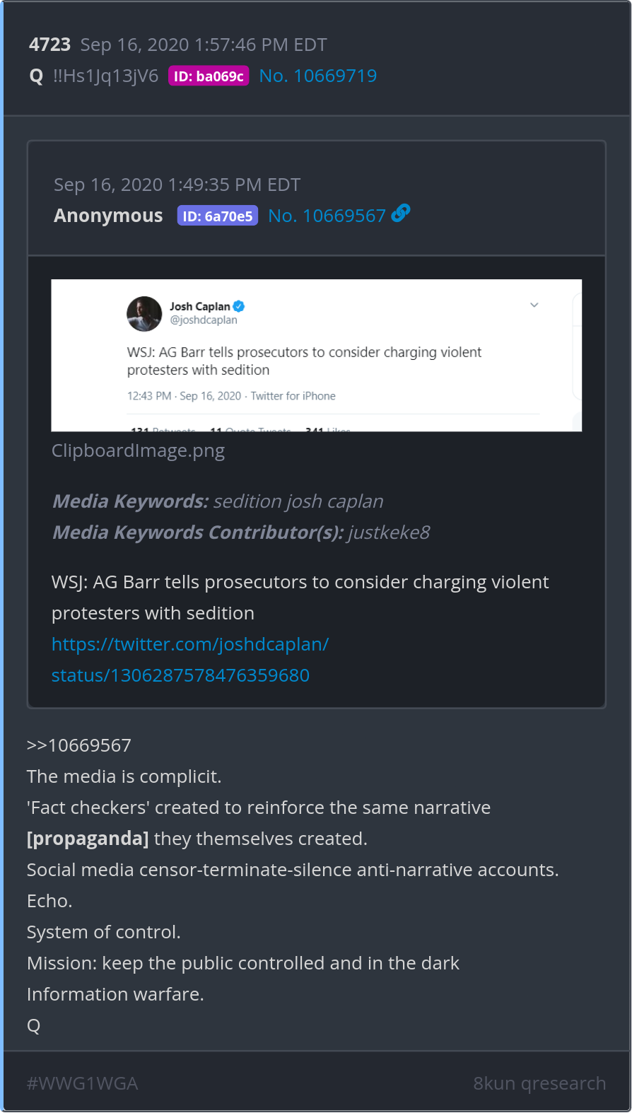 WSJ: AG Barr tells prosecutors to consider charging violent protesters with sedition https://twitter.com/joshdcaplan/status/1306287578476359680 Posted 09/15/2025 09:13 PM Categories Clips, Q