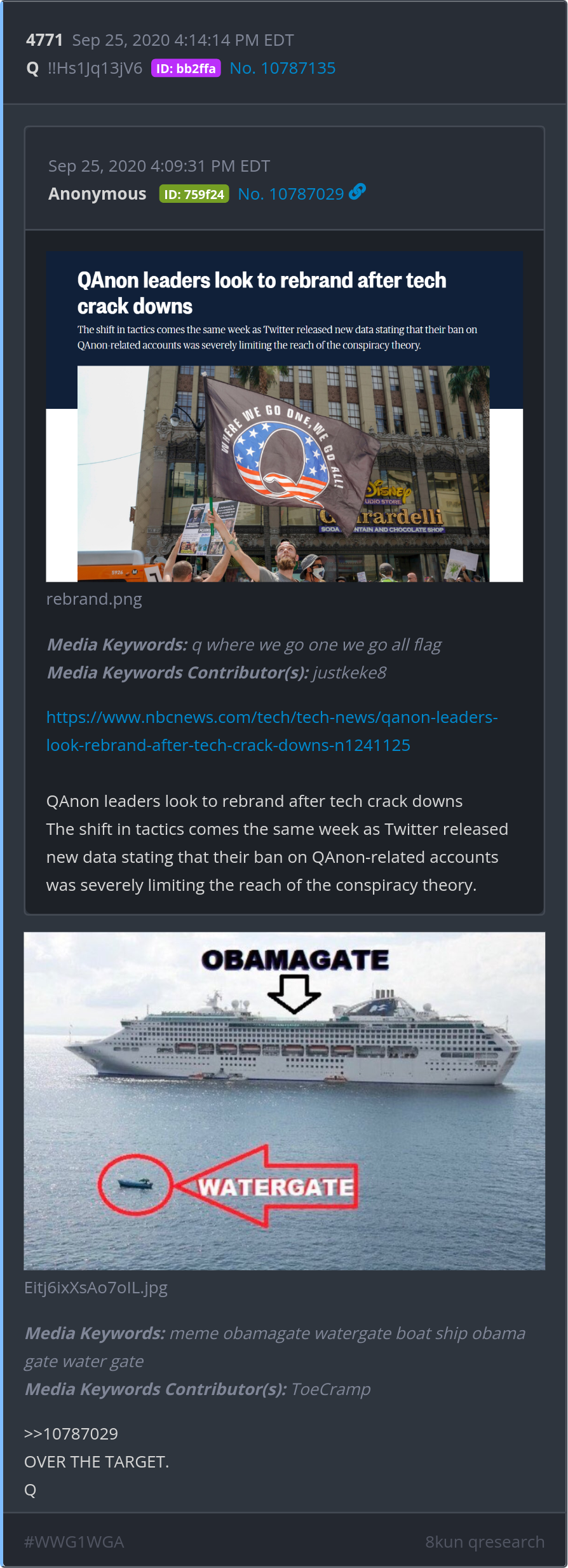 OVER THE TARGET. https://www.nbcnews.com/tech/tech-news/qanon-leaders-look-rebrand-after-tech-crack-downs-n1241125 Posted 09/24/2025 08:06 PM Categories Clips, Q