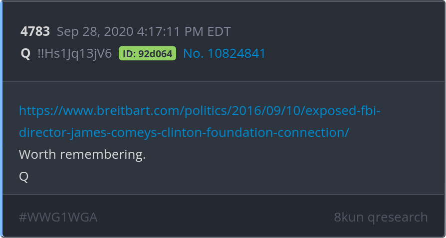 Worth remembering. https://www.breitbart.com/politics/2016/09/10/exposed-fbi-director-james-comeys-clinton-foundation-connection/ Posted 09/27/2025 08:32 PM Categories Clips, Q