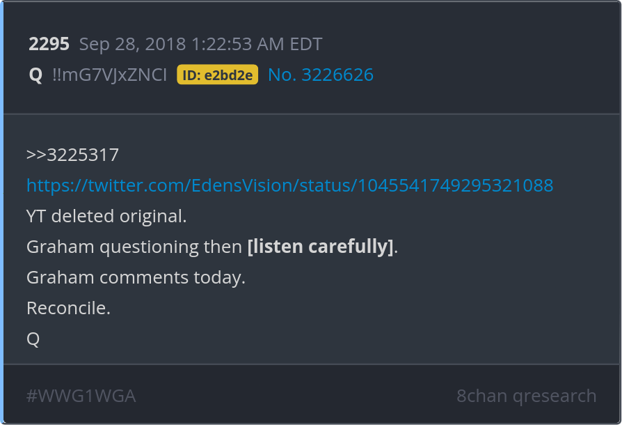 Graham questioning then [listen carefully]. https://twitter.com/EdensVision/status/1045541749295321088 Posted 09/27/2025 08:50 PM Categories Clips, Q