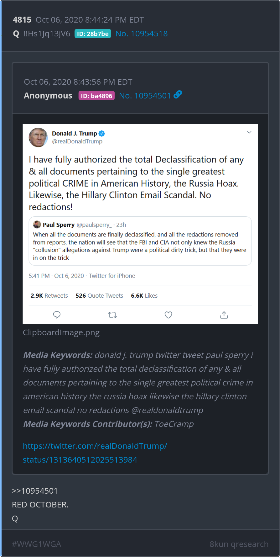 RED OCTOBER. https://twitter.com/realDonaldTrump/status/1313640512025513984 Posted 10/05/2025 07:22 PM Categories Clips, Q