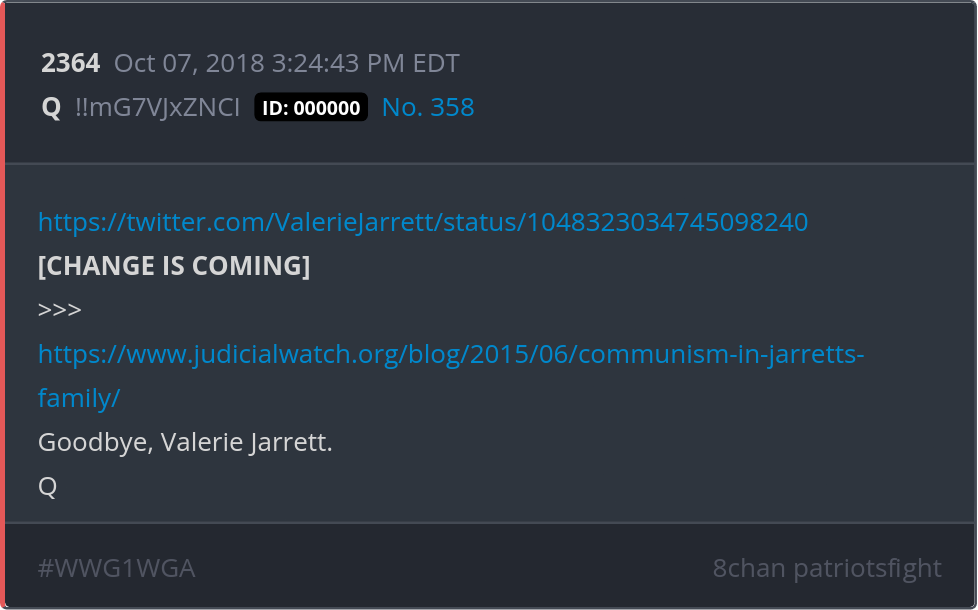 [CHANGE IS COMING] https://twitter.com/ValerieJarrett/status/1048323034745098240 https://www.judicialwatch.org/blog/2015/06/communism-in-jarretts-family/ Posted 10/06/2025 07:57 PM Categories Clips, Q