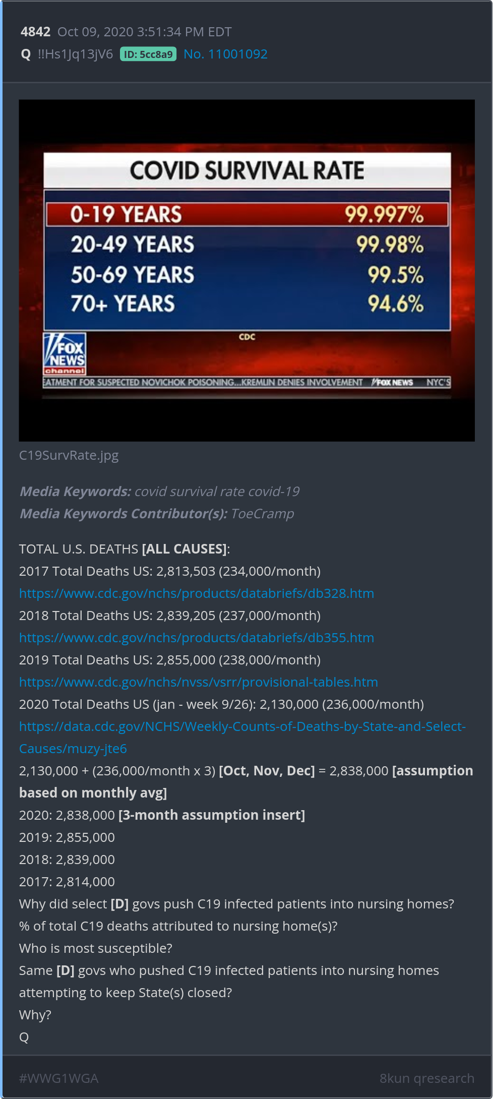 Who is most susceptible? Same [D] govs who pushed C19 infected patients into nursing homes attempting to keep State(s) closed? Why? https://www.cdc.gov/nchs/products/databriefs/db328.htm https://www.cdc.gov/nchs/products/databriefs/db355.htm https://www.cdc.gov/nchs/nvss/vsrr/provisional-tables.htm https://data.cdc.gov/NCHS/Weekly-Counts-of-Deaths-by-State-and-Select-Causes/muzy-jte6 Posted 10/08/2025 08:03 PM Categories Clips, Q