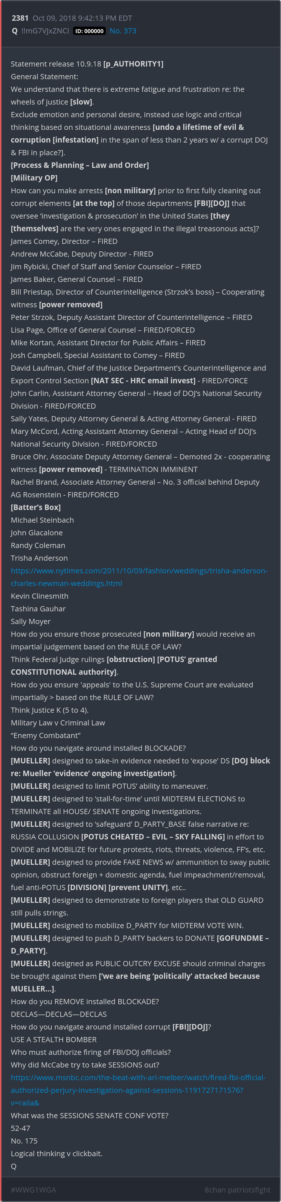 What was the SESSIONS SENATE CONF VOTE? 52-47 No. 175 Logical thinking v clickbait. https://www.nytimes.com/2011/10/09/fashion/weddings/trisha-anderson-charles-newman-weddings.html https://www.msnbc.com/the-beat-with-ari-melber/watch/fired-fbi-official-authorized-perjury-investigation-against-sessions-1191727171576?v=raila& Posted 10/08/2025 08:12 PM Categories Clips, Q