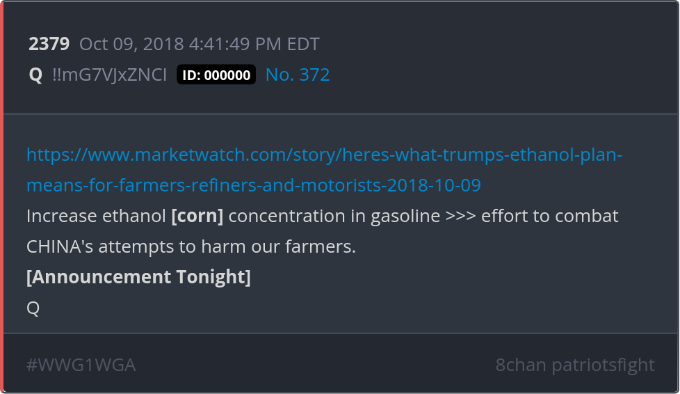 Increase ethanol [corn] concentration in gasoline >>> effort to combat CHINA's attempts to harm our farmers. https://www.marketwatch.com/story/heres-what-trumps-ethanol-plan-means-for-farmers-refiners-and-motorists-2018-10-09 Posted 10/08/2025 08:15 PM Categories Clips, Q