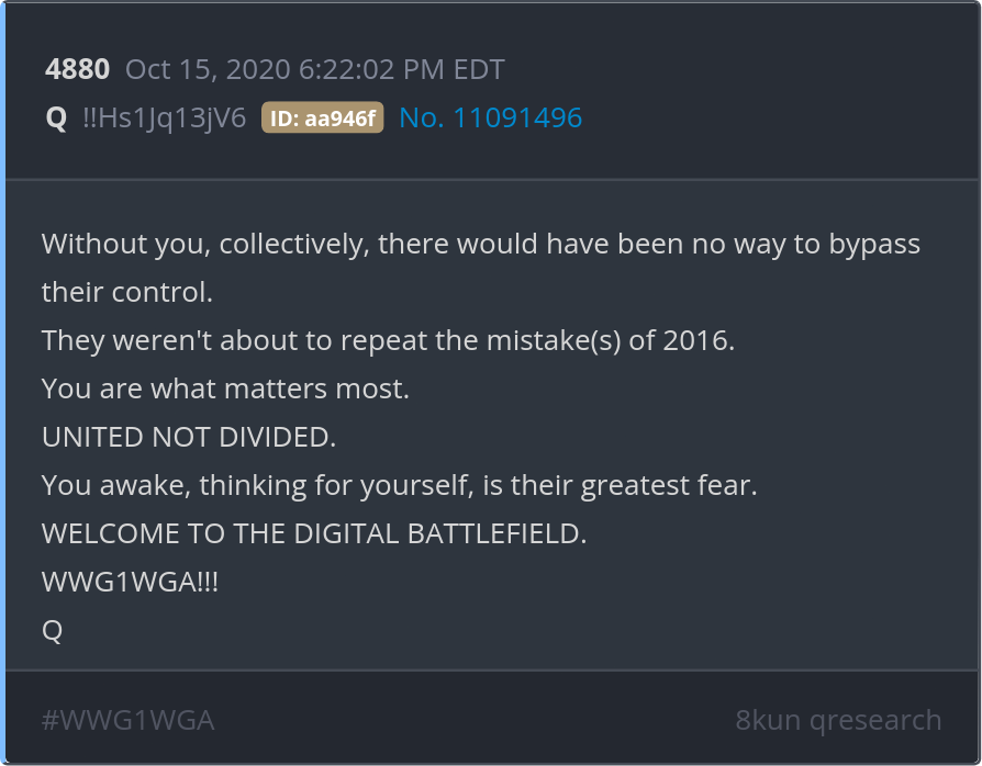 UNITED NOT DIVIDED. You awake, thinking for yourself, is their greatest fear. WELCOME TO THE DIGITAL BATTLEFIELD. WWG1WGA!!! Posted 10/14/2025 08:10 PM Categories Clips, Q