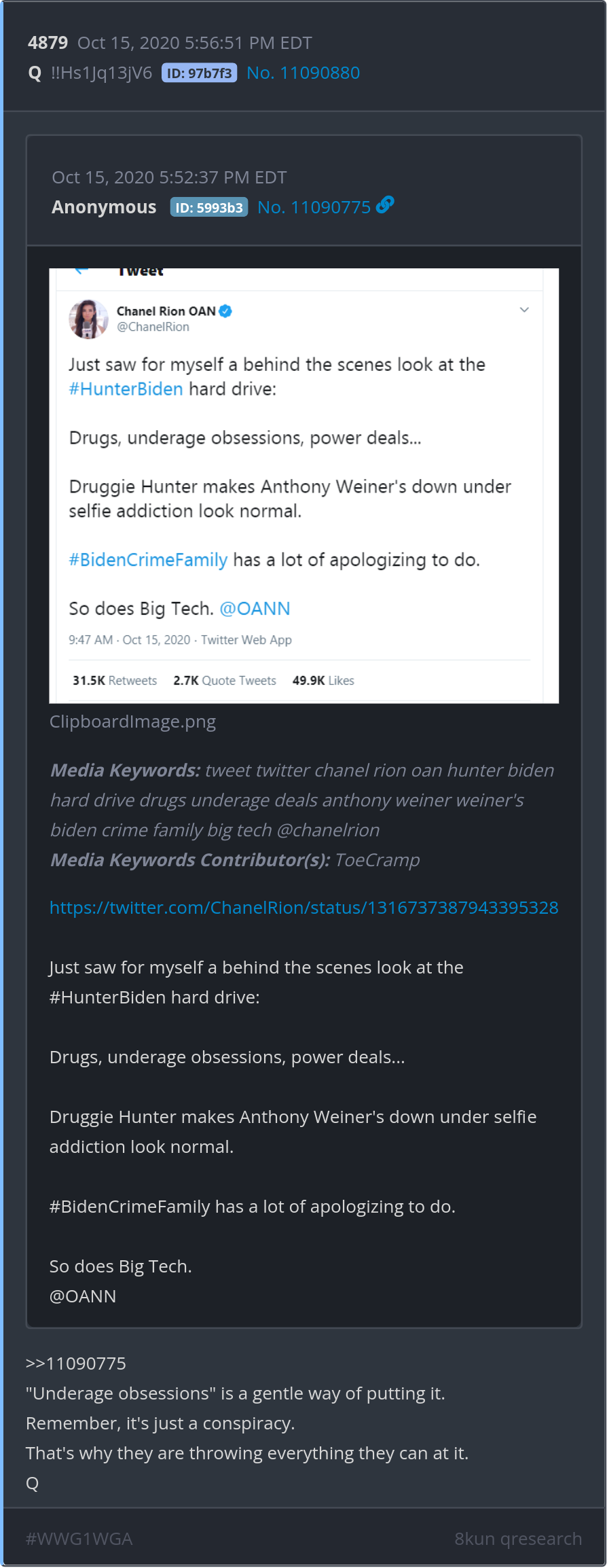 "Underage obsessions" is a gentle way of putting it. Remember, it's just a conspiracy. That's why they are throwing everything they can at it. https://twitter.com/ChanelRion/status/1316737387943395328 Posted 10/14/2025 08:11 PM Categories Clips, Q