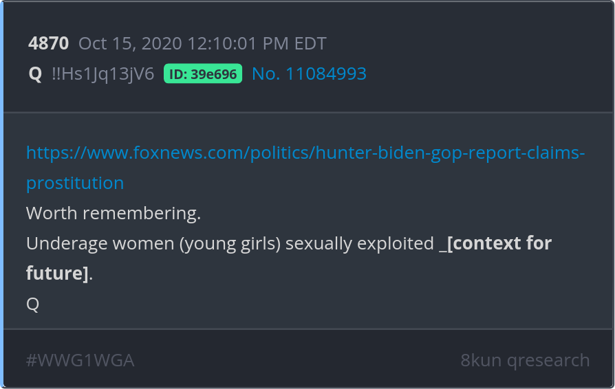 Worth remembering. Underage women (young girls) sexually exploited _[context for future]. https://www.foxnews.com/politics/hunter-biden-gop-report-claims-prostitution Posted 10/14/2025 08:21 PM Categories Clips, Q
