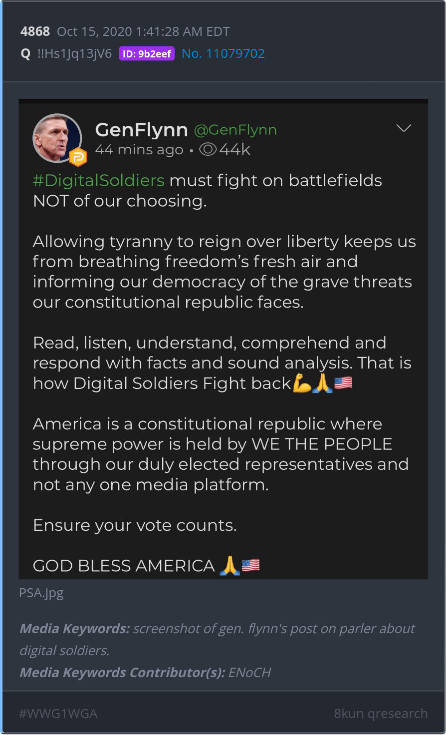 screenshot of gen. flynn's post on parler about digital soldiers. Posted 10/14/2025 08:24 PM Categories Clips, Q