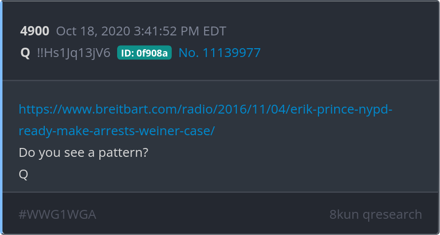 Do you see a pattern? https://www.breitbart.com/radio/2016/11/04/erik-prince-nypd-ready-make-arrests-weiner-case/ Posted 10/17/2025 08:24 PM Categories Clips, Q