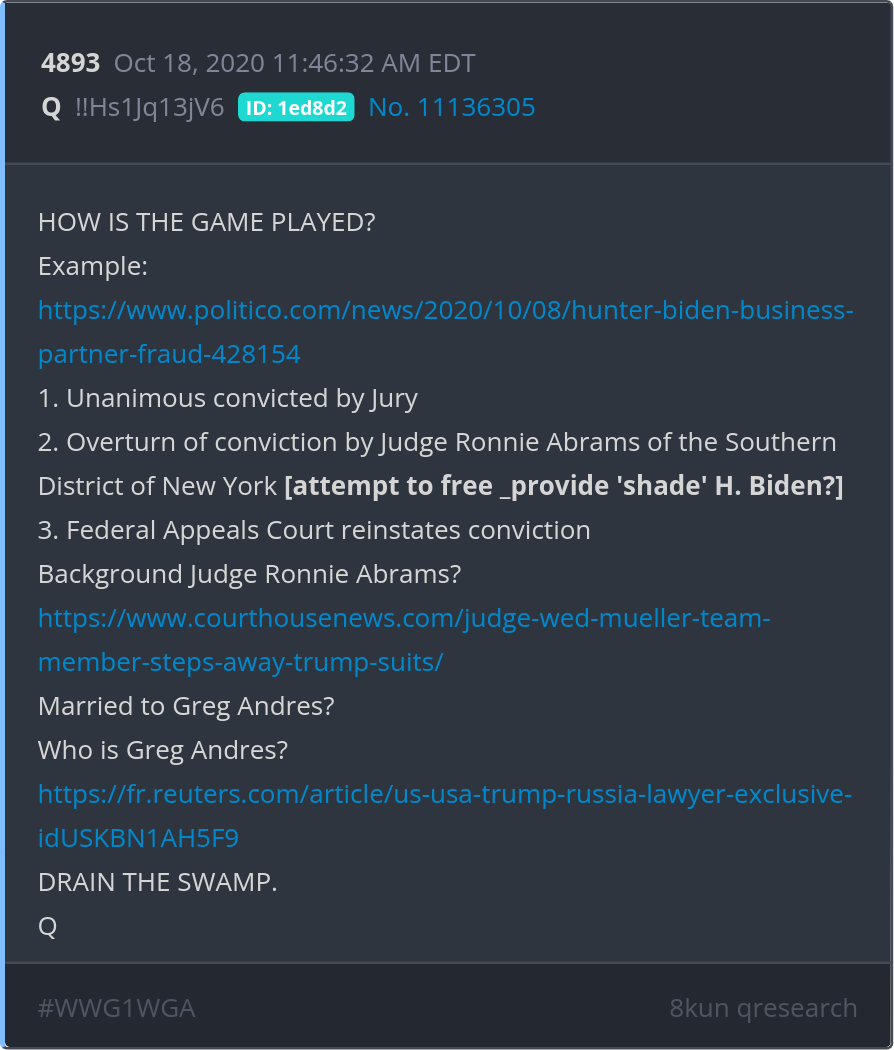 DRAIN THE SWAMP. https://www.politico.com/news/2020/10/08/hunter-biden-business-partner-fraud-428154 https://www.courthousenews.com/judge-wed-mueller-team-member-steps-away-trump-suits/ https://fr.reuters.com/article/us-usa-trump-russia-lawyer-exclusive-idUSKBN1AH5F9 Posted 10/17/2025 08:35 PM Categories Clips, Q