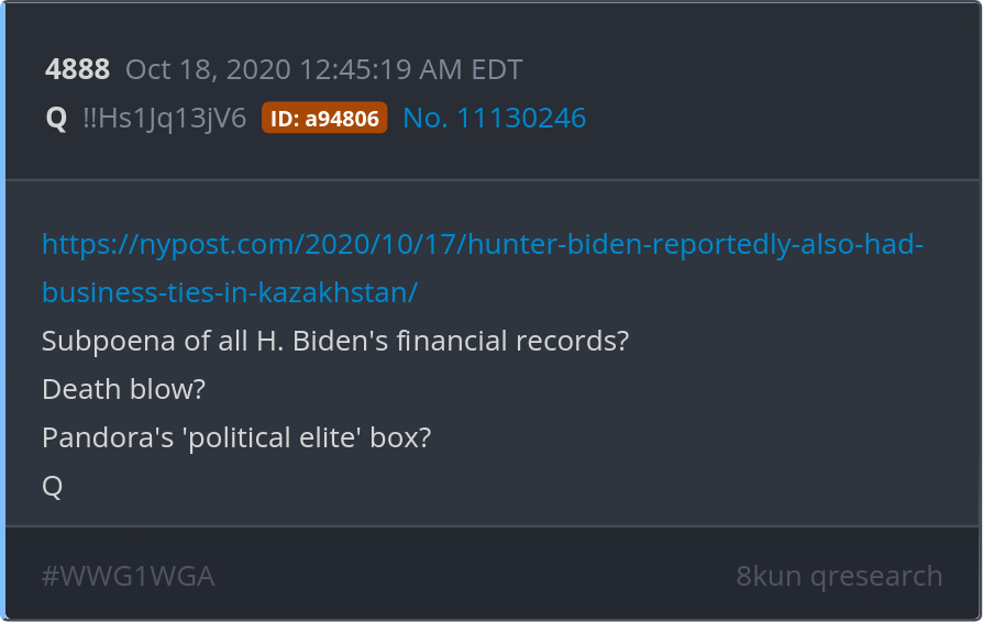 Subpoena of all H. Biden's financial records? Death blow? Pandora's 'political elite' box? https://nypost.com/2020/10/17/hunter-biden-reportedly-also-had-business-ties-in-kazakhstan/ Posted 10/17/2025 08:41 PM Categories Clips, Q