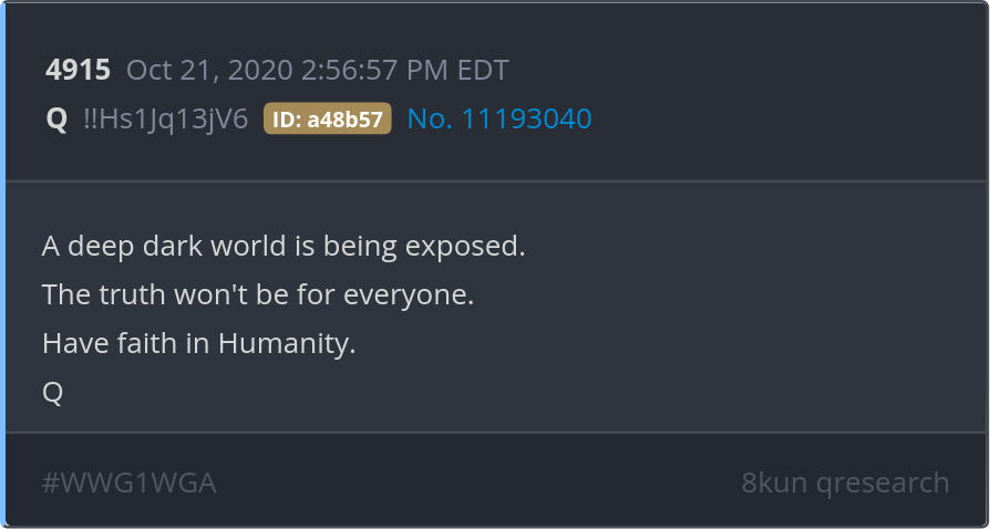 A deep dark world is being exposed. The truth won't be for everyone. Have faith in Humanity. Posted 10/20/2025 08:13 PM Categories Clips, Q