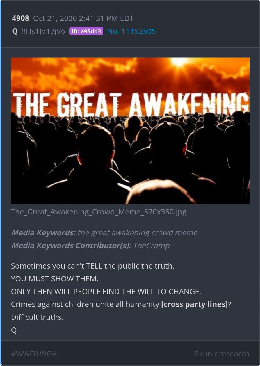 Sometimes you can't TELL the public the truth. YOU MUST SHOW THEM. ONLY THEN WILL PEOPLE FIND THE WILL TO CHANGE. Crimes against children unite all humanity [cross party lines]? Difficult truths. Posted 10/20/2025 08:19 PM Categories Clips, Q