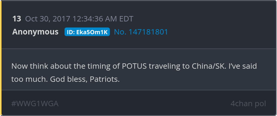 Now think about the timing of POTUS traveling to China/SK. I’ve said too much. God bless, Patriots. Posted 10/28/2025 01:08 PM Categories Clips, Q