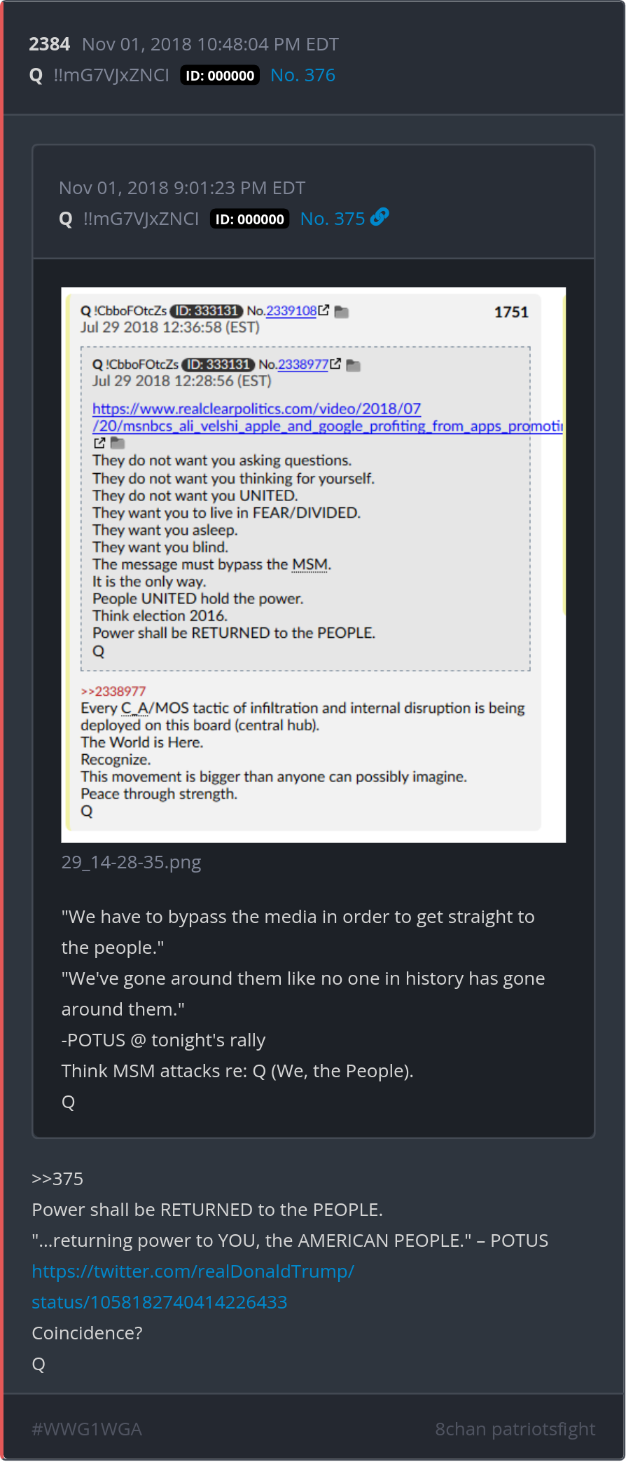 Power shall be RETURNED to the PEOPLE. "…returning power to YOU, the AMERICAN PEOPLE." – POTUS https://twitter.com/realDonaldTrump/status/1058182740414226433 Posted 10/31/2025 08:57 PM Categories Clips, Q