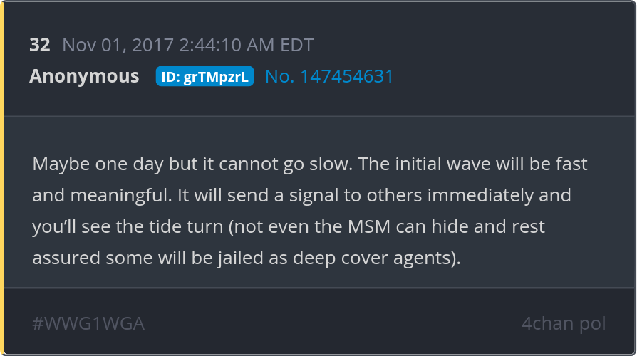 The initial wave will be fast and meaningful. It will send a signal to others immediately and you’ll see the tide turn (not even the MSM can hide and rest assured some will be jailed as deep cover agents). Posted 10/31/2025 09:03 PM Categories Clips, Q