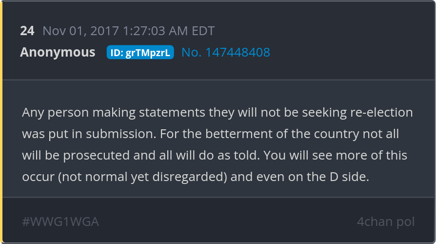 Any person making statements they will not be seeking re-election was put in submission. For the betterment of the country not all will be prosecuted and all will do as told. Posted 10/31/2025 09:14 PM Categories Clips, Q