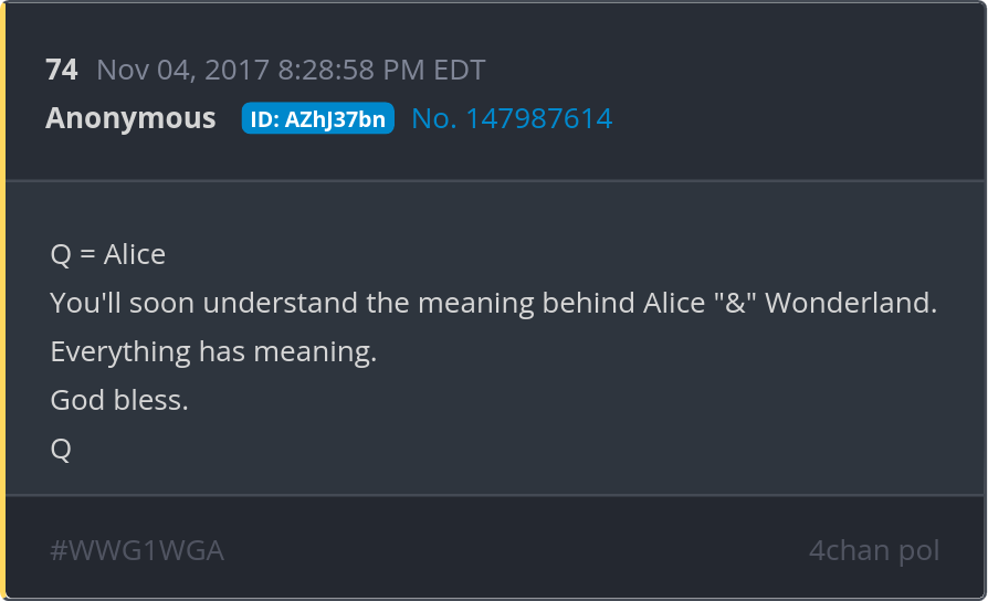 Q = Alice You'll soon understand the meaning behind Alice "&" Wonderland. Everything has meaning. God bless. Posted 11/03/2025 08:14 PM Categories Clips, Q