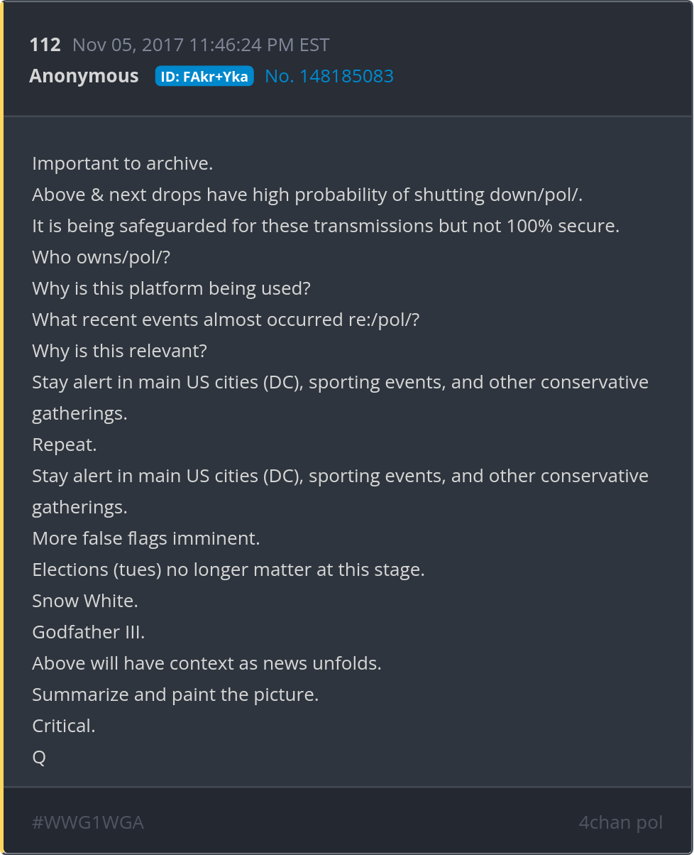 Stay alert in main US cities (DC), sporting events, and other conservative gatherings. More false flags imminent. Elections (tues) no longer matter at this stage. Posted 11/04/2025 08:40 PM Categories Clips, Q