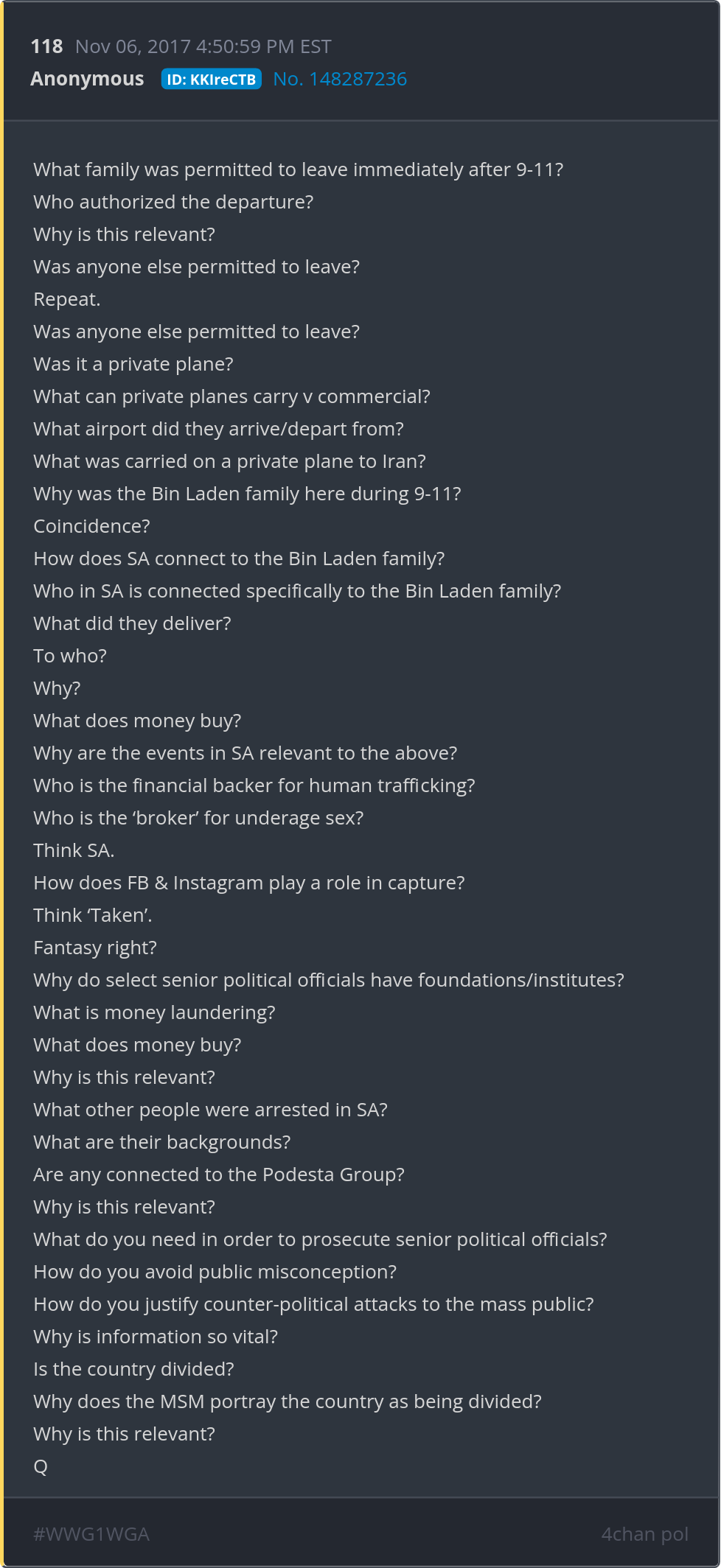What family was permitted to leave immediately after 9-11? Who authorized the departure? Why is this relevant? Was anyone else permitted to leave? Repeat. Posted 11/05/2025 08:36 PM Categories Clips, Q