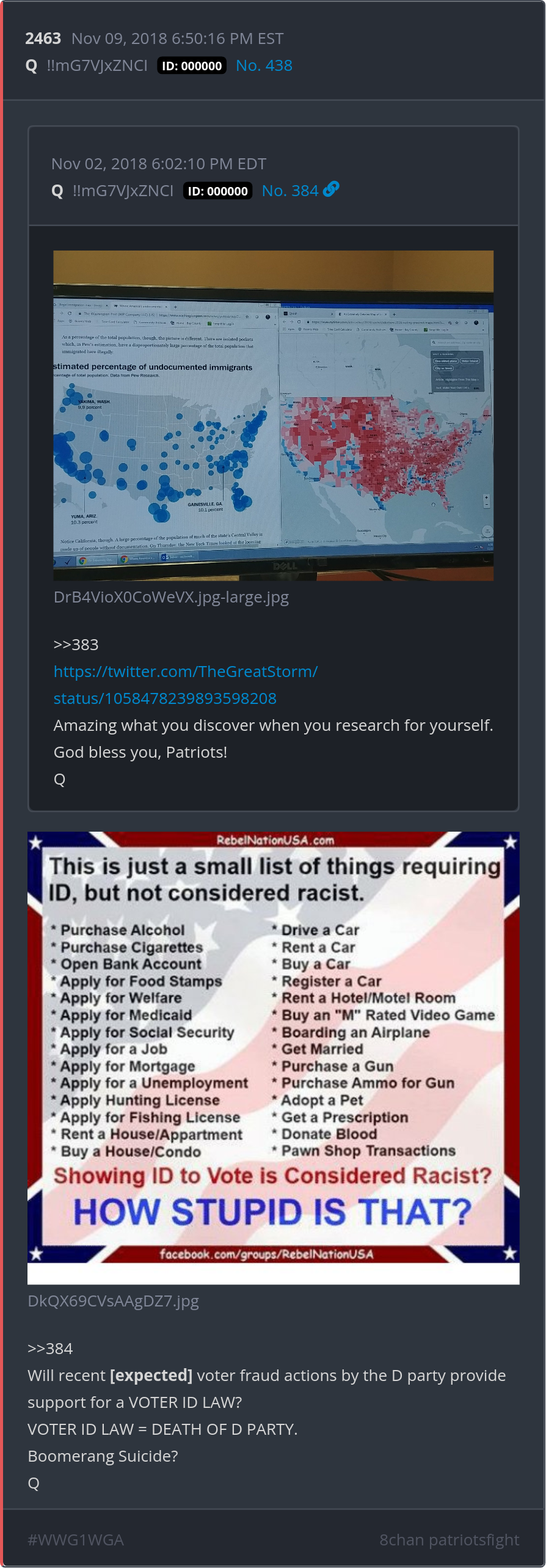 Will recent [expected] voter fraud actions by the D party provide support for a VOTER ID LAW? VOTER ID LAW = DEATH OF D PARTY. Boomerang Suicide? https://twitter.com/TheGreatStorm/status/1058478239893598208 Posted 11/08/2025 07:55 PM Categories Clips, Q